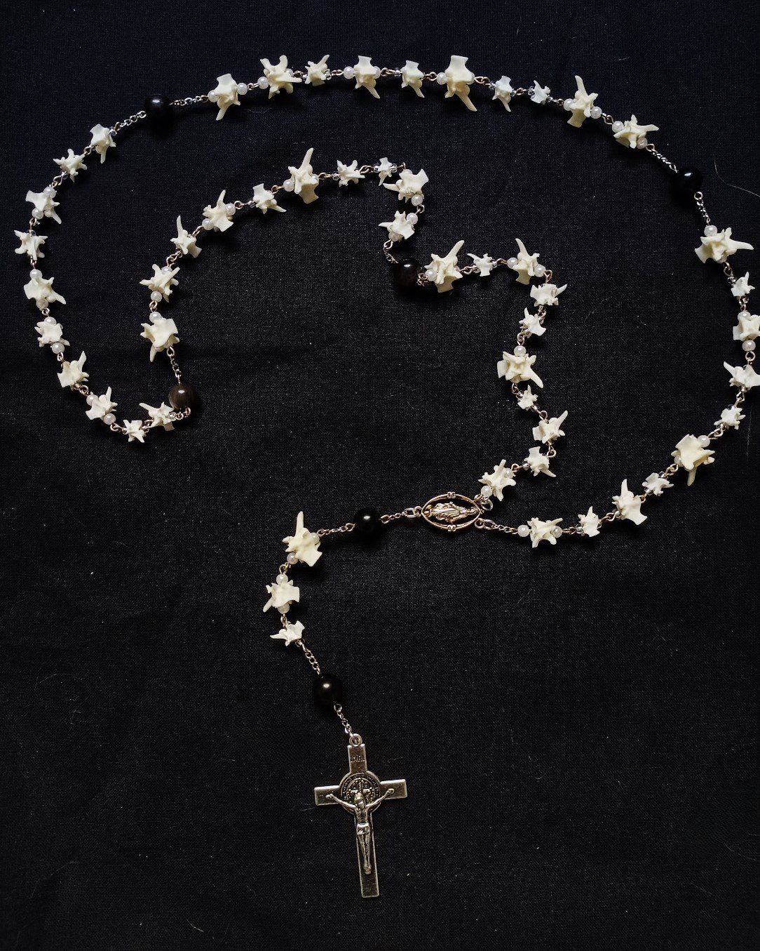 Each rosary is meticulously handcrafted using ethically sourced animal bones, primarily real snake vertebrae. These materials are responsibly collected from naturally deceased animals or roadkill, ensuring no harm is inflicted for art's sake.